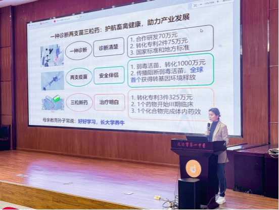 在科研分享环节,贺兰用通俗易懂的语言,揭开了现代农业科技的神秘面纱。她以“妈妈肚子里的蛔虫”为例,趣味解读寄生虫传播的科学原理;又用真实数据直面我国畜禽疫病防控技术曾长期“跟跑”国外的困境——关键药物上市滞后国外五十余年,宠物驱虫药市场被外企垄断,高额利润源源不断流向海外。