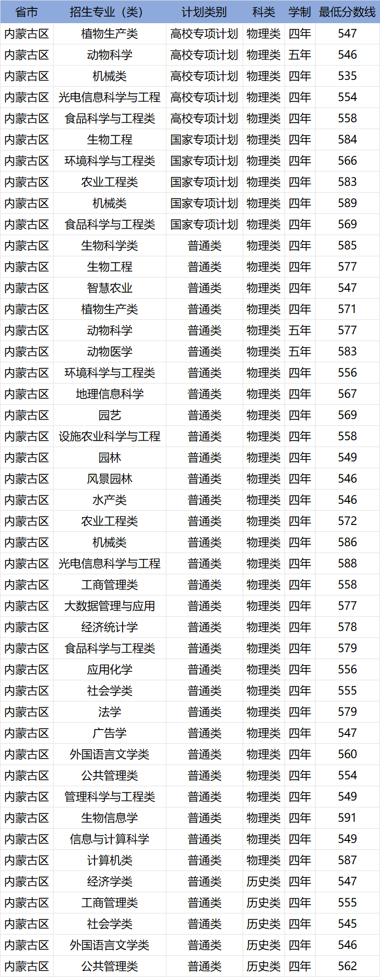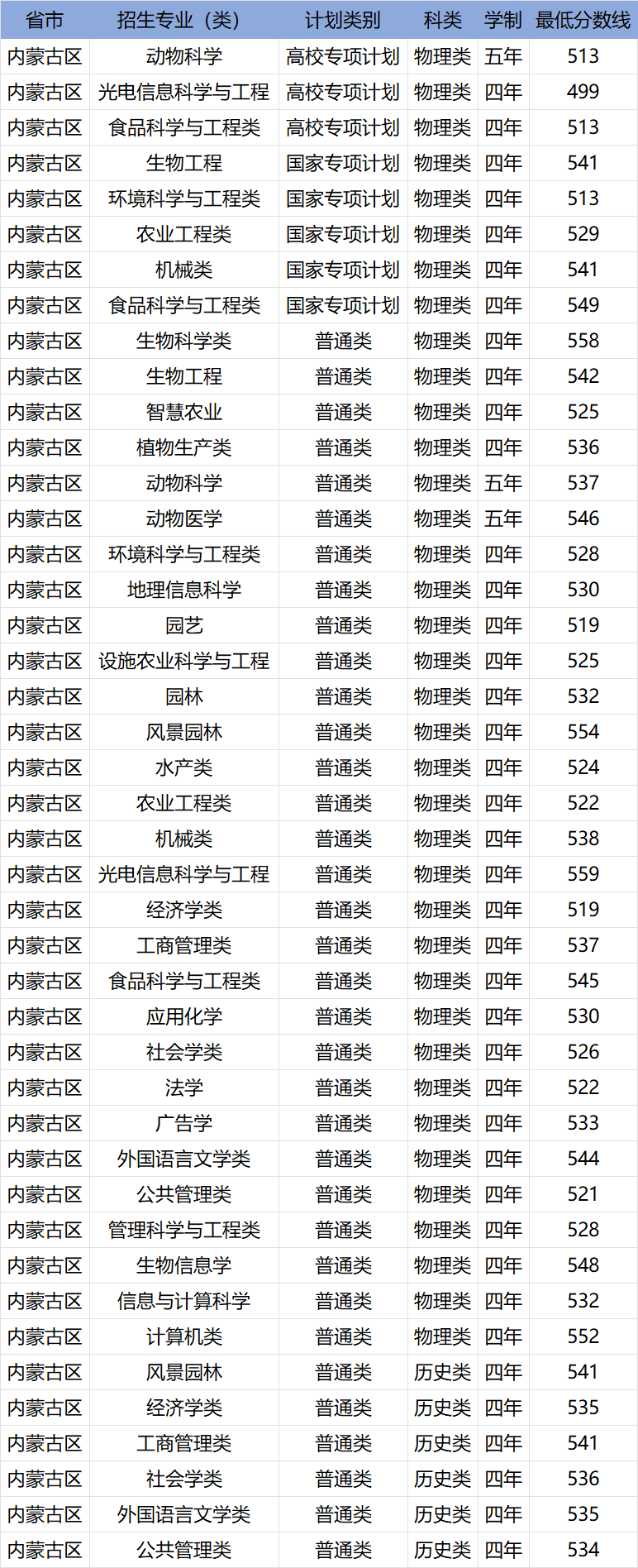 华中农业大学2022-2024年内蒙古自治区分专业分数线