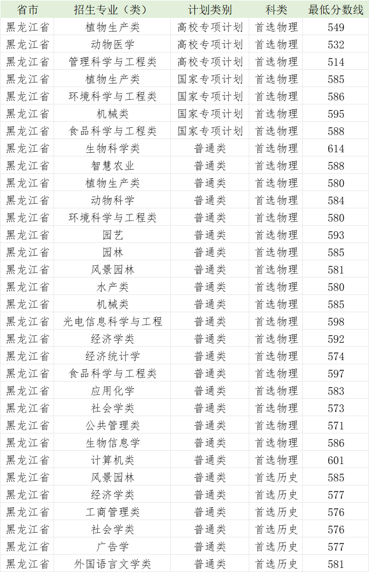 华中农业大学2023年黑龙江省各专业录取分数线