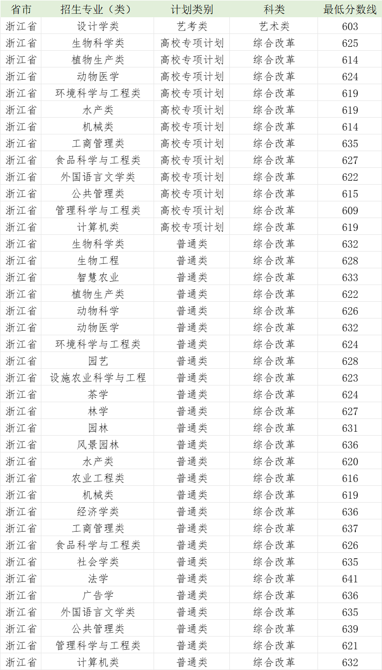 华中农业大学2023年浙江省各专业录取分数线