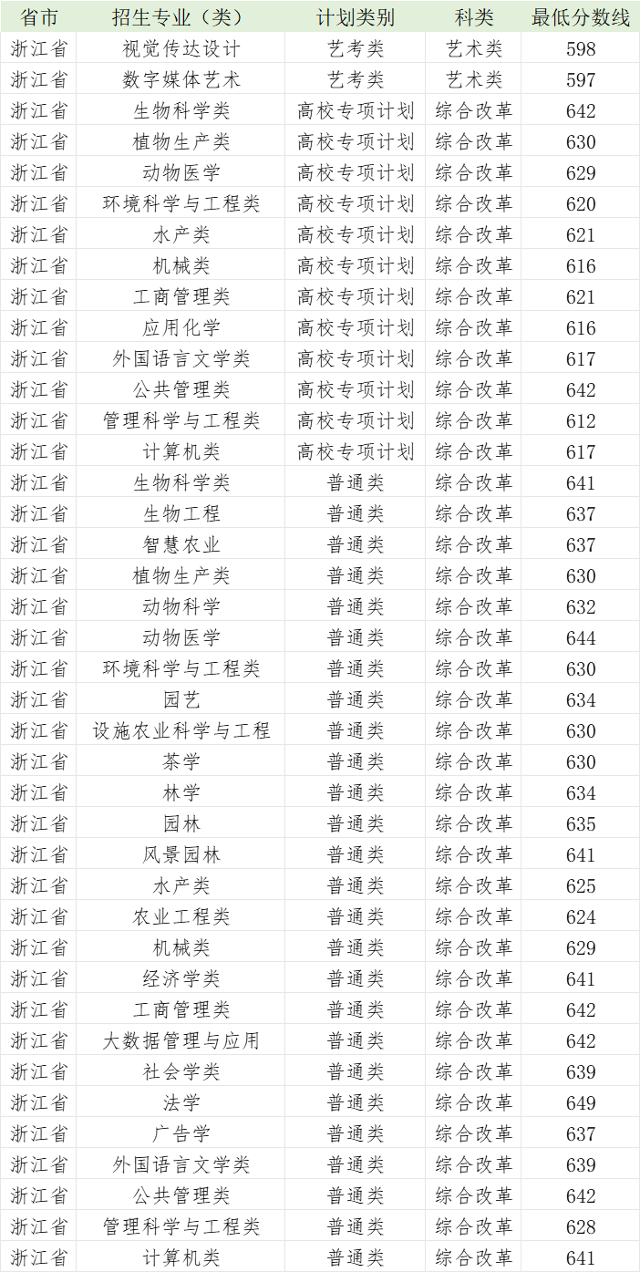 华中农业大学2023年浙江省各专业录取分数线