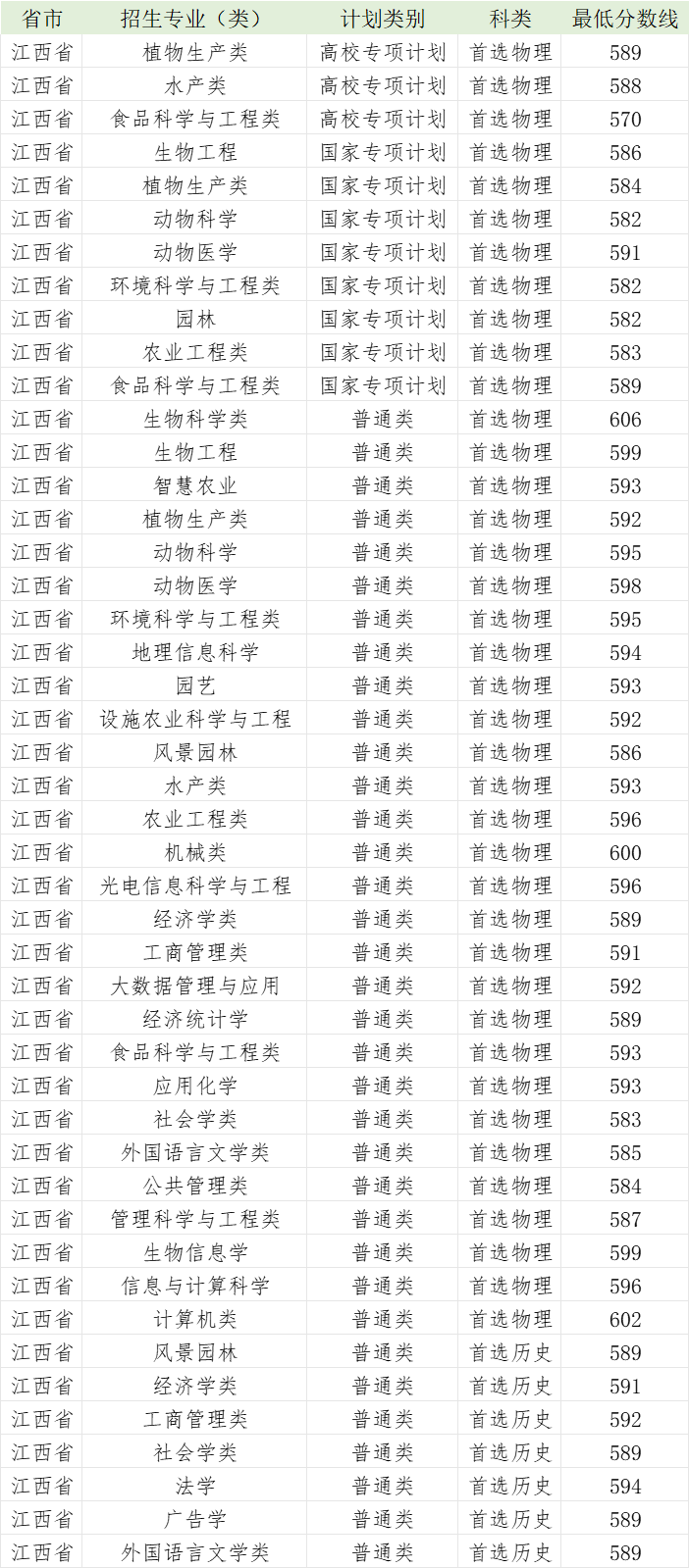 华中农业大学2023年江西省各专业录取分数线