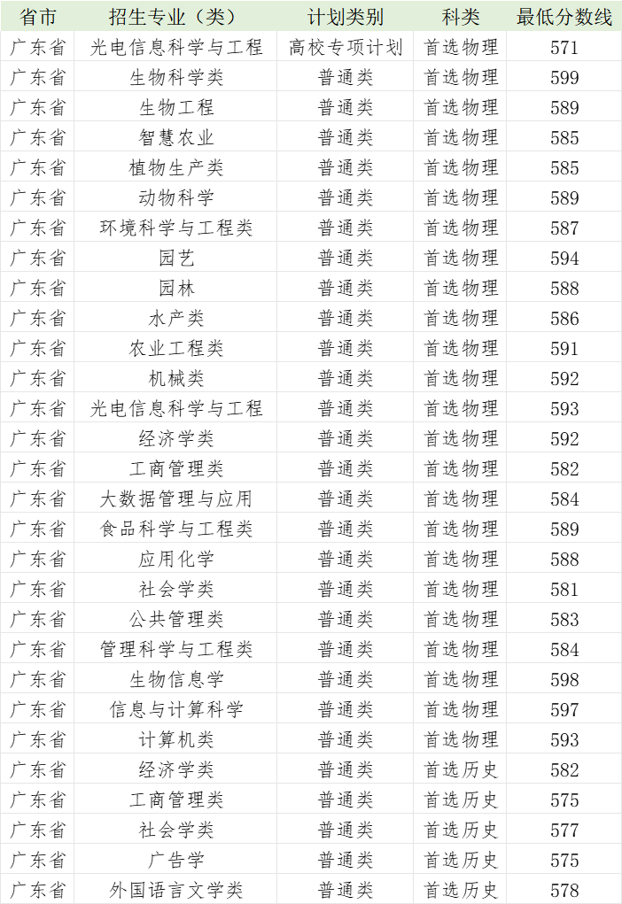 华中农业大学2023年广东省各专业录取分数线