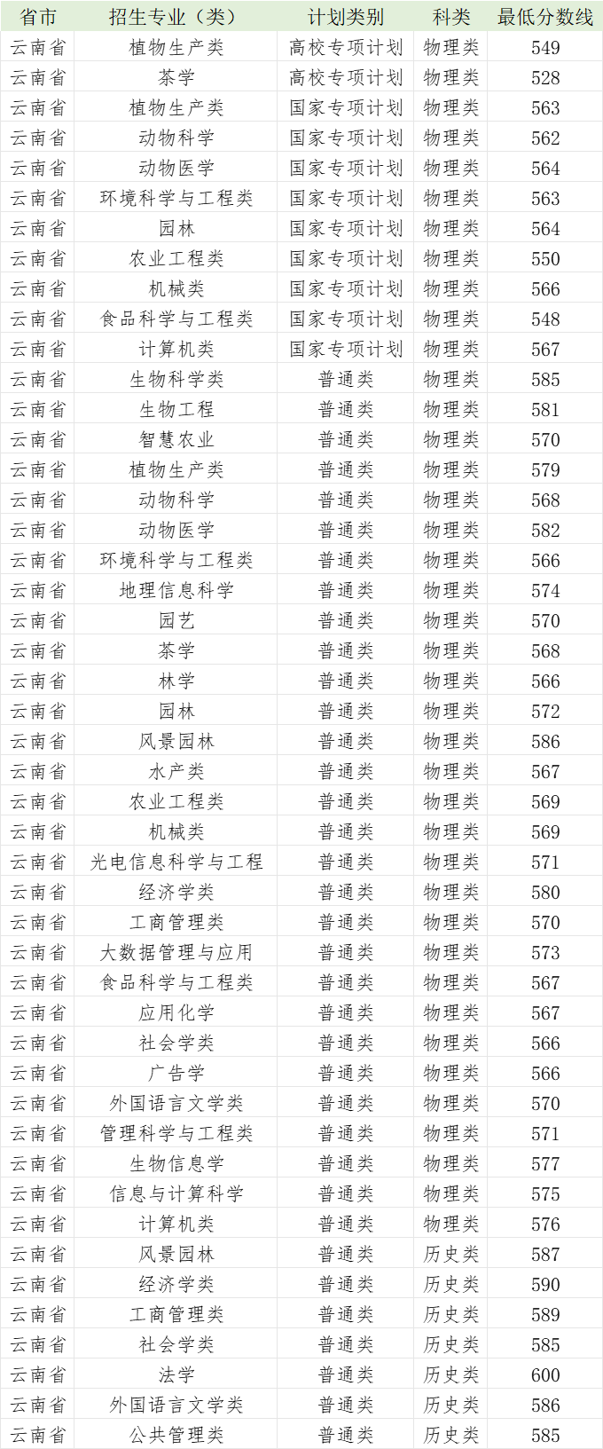 华中农业大学2022年云南省各专业录取分数线