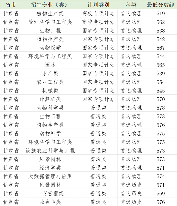 华中农业大学2024年甘肃省各专业录取分数线